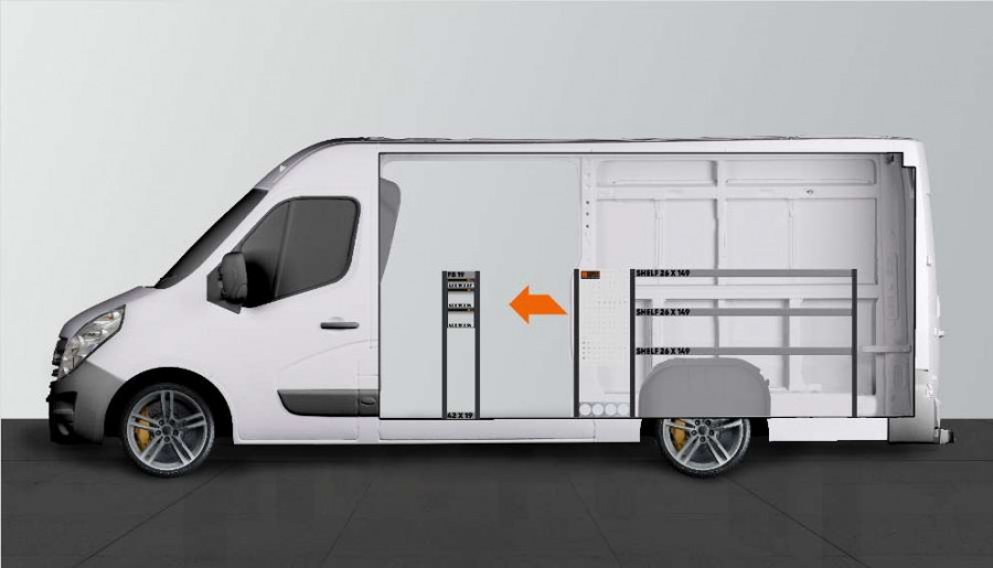 Vil du optimere din Opel Movano, Renault Master & Nissan NV400 L3 med en ekstra indretning? Det er en indretning, som gør det muligt at bevare bredden i bilen, da indretningen er 260 mm dyb. Indretningen har 3 stk. skuffer på kuglelejeskinner i varierende størrelser for at skabe forskellige opbevaringsmuligheder. Disse kan suppleres med indsatskit eller skuffeindsatser for optimal organisering. Hylderummet bag skuffeelementet suppleres ofte med modulbakker.