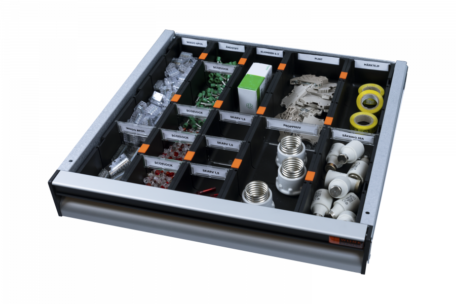 Dette kit består af 1 stk. 105 mm bred, 1 stk. 80 mm bred og 3 stk. 70 mm brede indsatser med tilhørende låseclips og 2 stk. skillevægge pr. indsats.