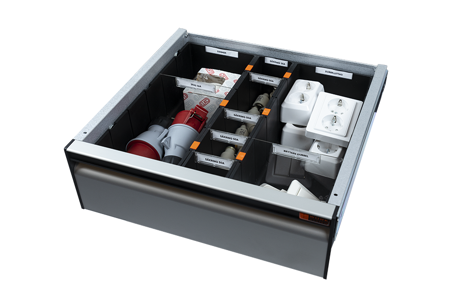 Hver indsatsboks og rumdeler har et etiket rum, der skaber de bedste betingelser for orden og organisering i din firmabil.
