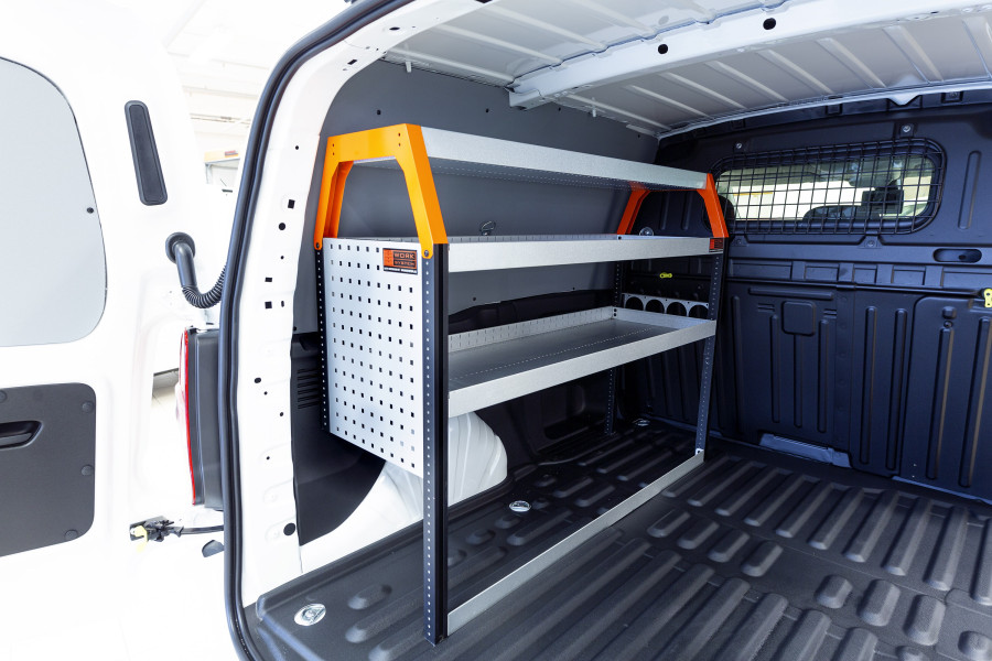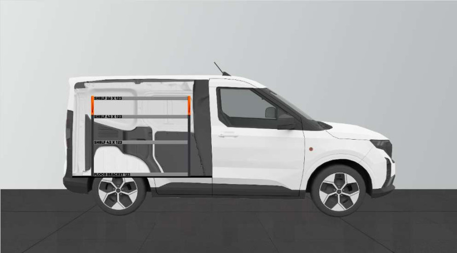 En bilindretning til din Ford Courier L1, som giver gode opbevaringsmuligheder til både værktøjskufferter, maskiner og det mindre sortiment. Indretningens hylder med en dybde på 420 mm gør, at de fleste af markedets værktøjskufferter passer perfekt. Den øverste hylde på 262,5 mm suppleres ofte med vores modulbakker til opbevaring af mindre dele. Glem ikke at udnytte værktøjstavlen på gavlen.