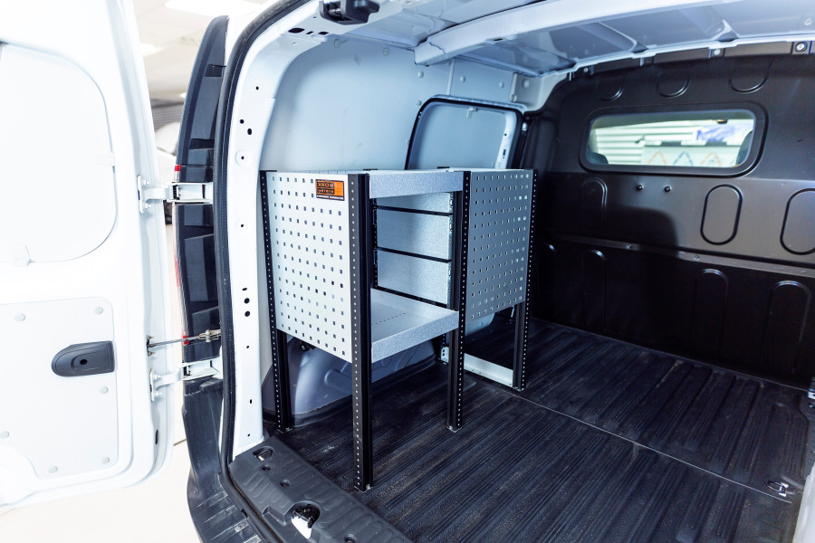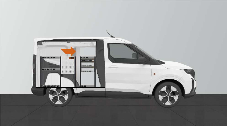 En af de mest populære indretninger til din Ford Courier L1. Indretningen giver varierende opbevaringsmuligheder, da der er nem adgang til skufferne på kuglelejerne fra sidedøren, samtidig med at skufferne kan trækkes ud i kørselsretningen for at give et godt overblik. Disse kan suppleres med skuffeinddelere for optimal organisering. Vores dybe hylder giver også gode opbevaringsmuligheder til både værktøjskufferter og mindre maskiner.