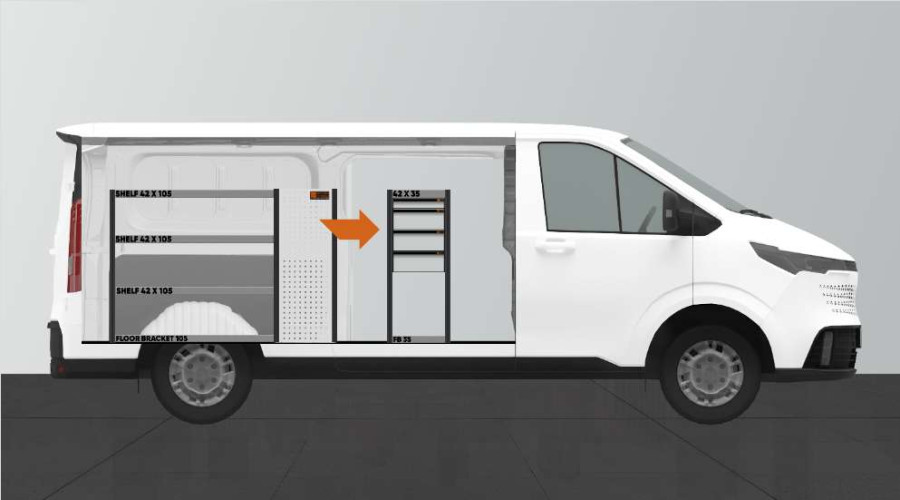 En af de mest populære indretninger til din MAXUS E-DELIVER 7 L2. Indretningen giver varierende opbevaringsmuligheder, da der er nem adgang til skufferne på kuglelejerne fra sidedøren, samtidig med at skufferne kan trækkes ud i kørselsretningen for at give et godt overblik. Disse kan suppleres med skuffeinddelere for optimal organisering. Vores dybe hylder giver også gode opbevaringsmuligheder til både værktøjskufferter og mindre maskiner.