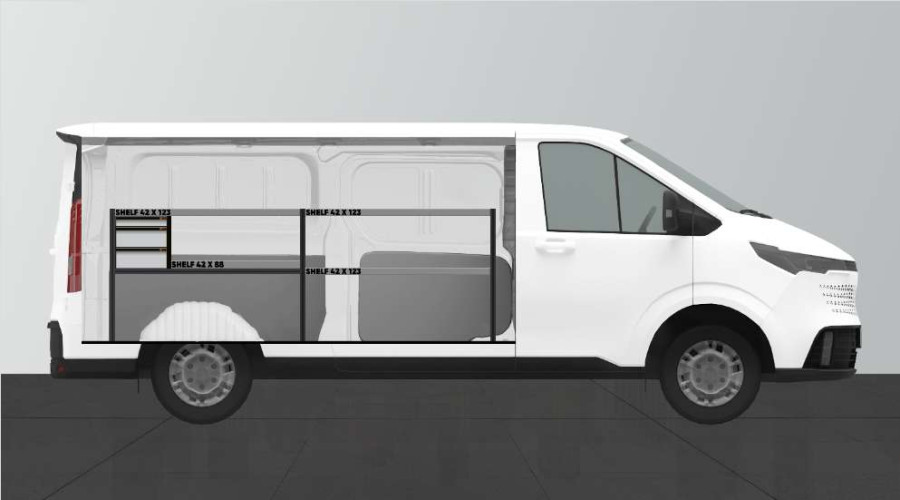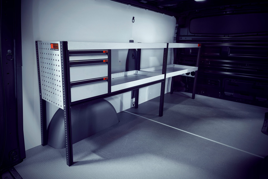 Et priseffektivt alternativ til dig, der har et enklere behov for opbevaring og vil have en kombination af skuffer på kuglelejeskinner men også hylder til din MAXUS E-DELIVER 7 L2. Indretningen er 420 mm dyb, hvilket gør, at de fleste af markedets værktøjskufferter passer perfekt. Skufferne kan med fordel suppleres med vores skuffeindsatser og inddelere, som giver dig gode muligheder for at organisere mindre dele.