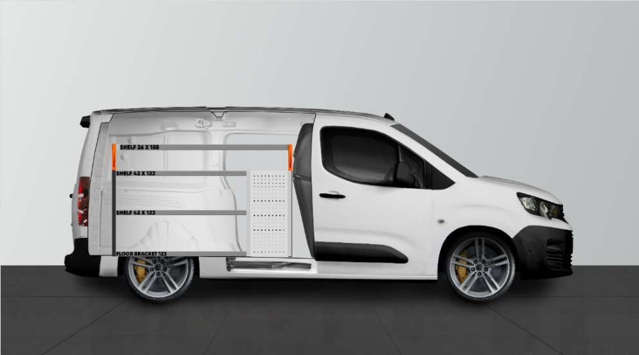 Dette er et af de mest populære systemer til Citroën Berlingo, Opel Combo, Fiat Doblo Toyota Proace City & Peugeot Partner L2, med sidedør i samme side som indretningen. Indretningen giver gode opbevaringsmuligheder for såvel værktøjskufferter og maskiner som de mindre dele. Du får en skuffeenhed med 5 stk. skuffer i varierende størrelser. Bag skufferne er der placeret en værktøjstavle for ekstra ophængningsmuligheder i bilen. Skufferne på kuglelejeskinner suppleres ofte med vores nye skuffeindsatser og rumdelere. Gavlen kan med fordel suppleres med vores smartboxes for at maksimere opbevaringspladsen.