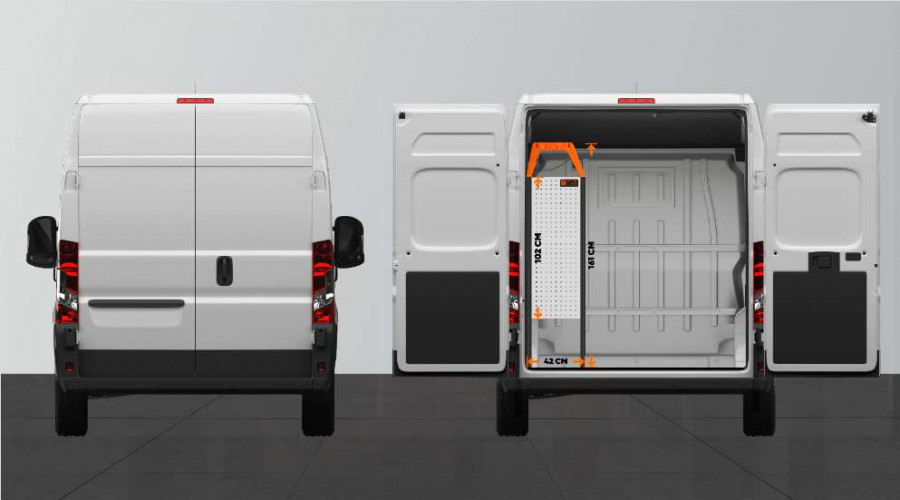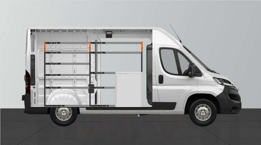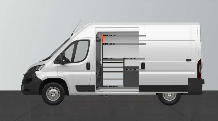 Med denne bilindretning får du meget opbevaring i både hylder og skuffer, der passer til Proace Max, Boxer, Ducato, Jumper & Movano L2.