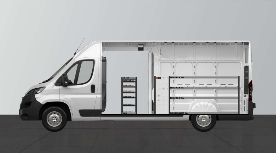 System med hyllförvaring och utdragbara lådor som man når smidigt från bilens sidodörr.
