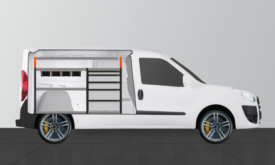 Kører du en Fiat Doblo og Opel Combo L2H1? Så er dette en komplet indretning til dig, der har store krav. Interiøret giver gode opbevaringsmuligheder både til værktøjskasser, maskiner og mindre sortiment. Du får en kommode med bokse af varierende størrelser for at give hver ting sin plads. Denne indretning omfatter 4 stk. af vores nye modulbakker for at skabe og holde orden på dit mindre sortiment. Kasserne på kuglelejer er populære som supplement til vores nye sortimentskasser for at skabe den bedste struktur. Den fordelte belastning i skufferne på kuglelejer er 35 kg / stk. De indvendige dimensioner af skufferne er (mm) B 579, D 3 87, H-60, H-130 og H-200
