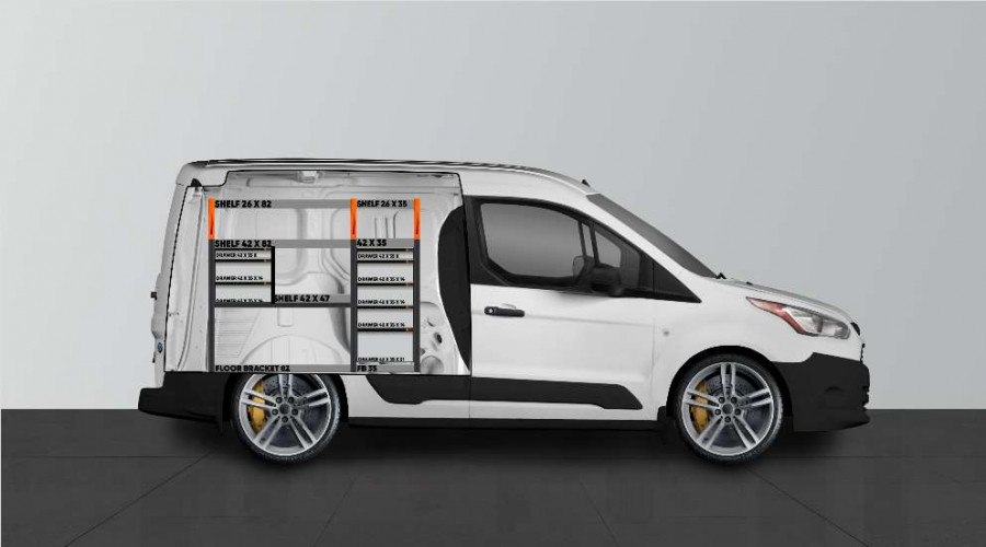 Leder du efter en indretning med masser af skuffer? Har du også store krav? Så er dette løsningen til dig og din Ford Connect L1H1. I alt er der inkluderet 8 stk. skuffer på kuglelejer. Indretningen giver gode opbevaringsmuligheder både til værktøjskasser, maskiner og mindre sortiment. Du får en kommode med bokse af varierende størrelse for at give hvert sted sin plads. Kasserne på kuglelejer er populære som supplement til vores nye sortimentskasser for at skabe den bedste struktur. Den fordelte belastning i skufferne på kuglelejer er 50 kg / stk. De indvendige dimensioner af skufferne er (mm) B 579, D 3 87, H-60, H-130 og H-200