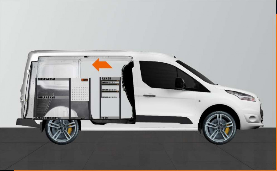 En af de mest populære indretninger til din Ford Connect L2. Indretningen giver varierende opbevaringsmuligheder, da der er nem adgang til skufferne på kuglelejerne fra sidedøren, samtidig med at skufferne kan trækkes ud i kørselsretningen for at give et godt overblik. Disse kan suppleres med skuffeinddelere for optimal organisering. Vores dybe hylder giver også gode opbevaringsmuligheder til både værktøjskufferter og mindre maskiner.