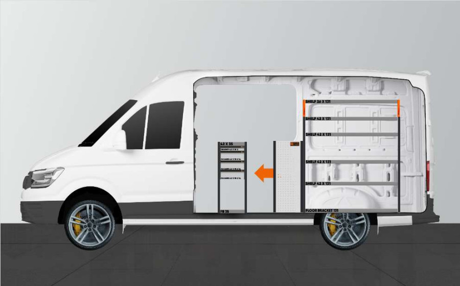 En af de mest populære indretninger til din MAN TGE & Volkswagen Crafter L3. Indretningen giver varierende opbevaringsmuligheder, da der er nem adgang til skufferne på kuglelejerne fra sidedøren, samtidig med at skufferne kan trækkes ud i kørselsretningen for at give et godt overblik. Disse kan suppleres med skuffeinddelere for optimal organisering. Vores dybe hylder giver også gode opbevaringsmuligheder til både værktøjskufferter og mindre maskiner.