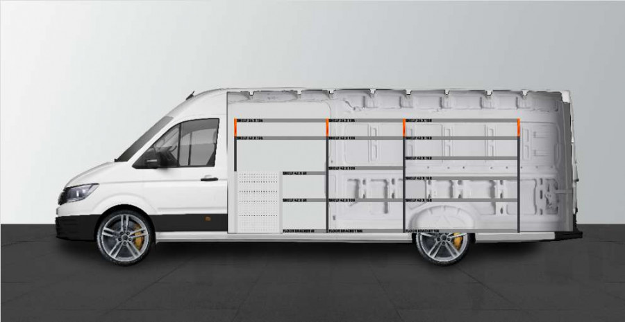 Med denne bilindretning får du meget opbevaring i både hylder og skuffer, der passer til Man TGE & VW Crafter L5.