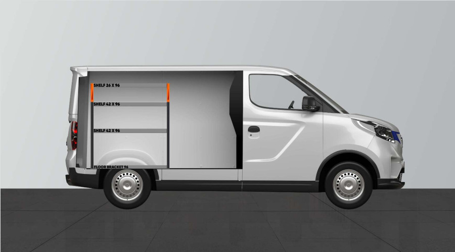 En kortere bilindretning til din Maxus e-Deliver 3 L1, som giver gode opbevaringsmuligheder til såvel værktøjskufferter og maskiner som det mindre sortiment. Indretningens hylder med en dybde på 420 mm gør, at de fleste af markedets værktøjskufferter passer perfekt. Den øverste hylde på 262,5 mm suppleres ofte med vores modulbakker til opbevaring af mindre dele. Indretningen passer til biler både med og uden sidedøre. Glem ikke at udnytte værktøjstavlen på gavlen.