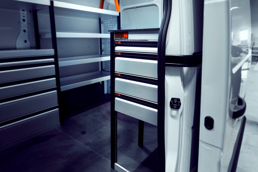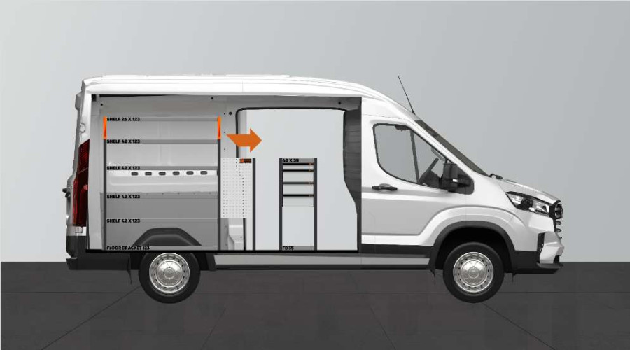 En af de mest populære indretninger til din Maxus e-Deliver 9 L2. Indretningen giver varierende opbevaringsmuligheder, da der er nem adgang til skufferne på kuglelejerne fra sidedøren, samtidig med at skufferne kan trækkes ud i kørselsretningen for at give et godt overblik. Disse kan suppleres med skuffeinddelere for optimal organisering. Vores dybe hylder giver også gode opbevaringsmuligheder til både værktøjskufferter og mindre maskiner.