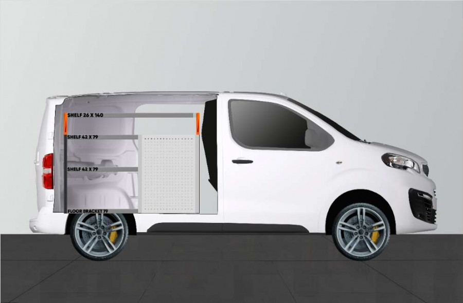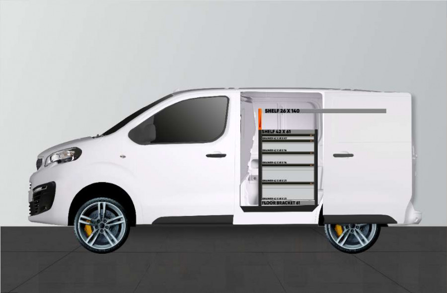 Med denne bilindretning får du meget opbevaring i både hylder og skuffer, der passer til Expert, Jumpy, Vivaro , Scudo & ProAce L1.