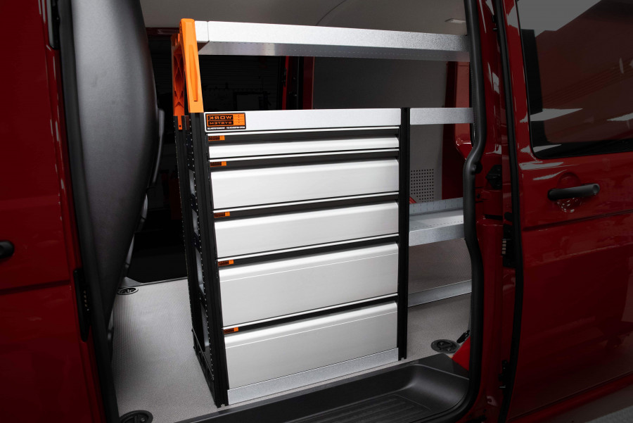 Dette er et af de mest populære systemer til Peugeot Expert, Citroen Jumpy, Opel Vivaro , Fiat Scudo & Toyota ProAce. Indretningen giver gode opbevaringsmuligheder for såvel værktøjskufferter og maskiner som de mindre dele. Du får en skuffeenhed med 5x skuffer i varierende størrelser. Skufferne på kuglelejeskinner suppleres ofte med vores nye skuffeindsatser og inddelere. Gavlen kan med fordel suppleres med vores smartboxes for at maksimere opbevaringspladsen.