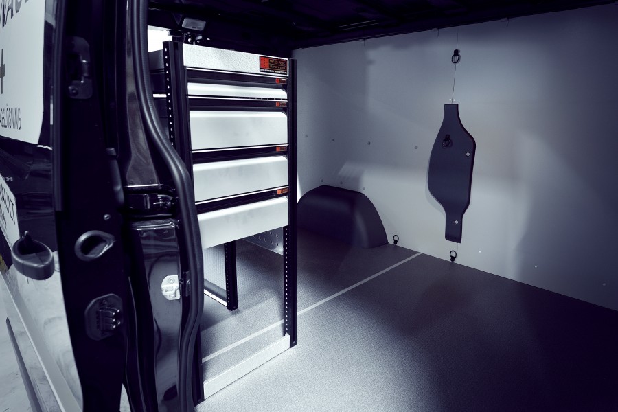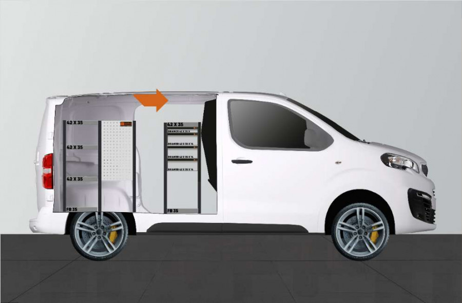 En af de mest populære indretninger til din Peugeot Expert, Citroen Jumpy, Opel Vivaro , Fiat Scudo & Toyota ProAce L1. Indretningen giver varierende opbevaringsmuligheder, da der er nem adgang til skufferne på kuglelejerne fra sidedøren, samtidig med at skufferne kan trækkes ud i kørselsretningen for at give et godt overblik. Disse kan suppleres med skuffeinddelere for optimal organisering. Vores dybe hylder giver også gode opbevaringsmuligheder til både værktøjskufferter og mindre maskiner.