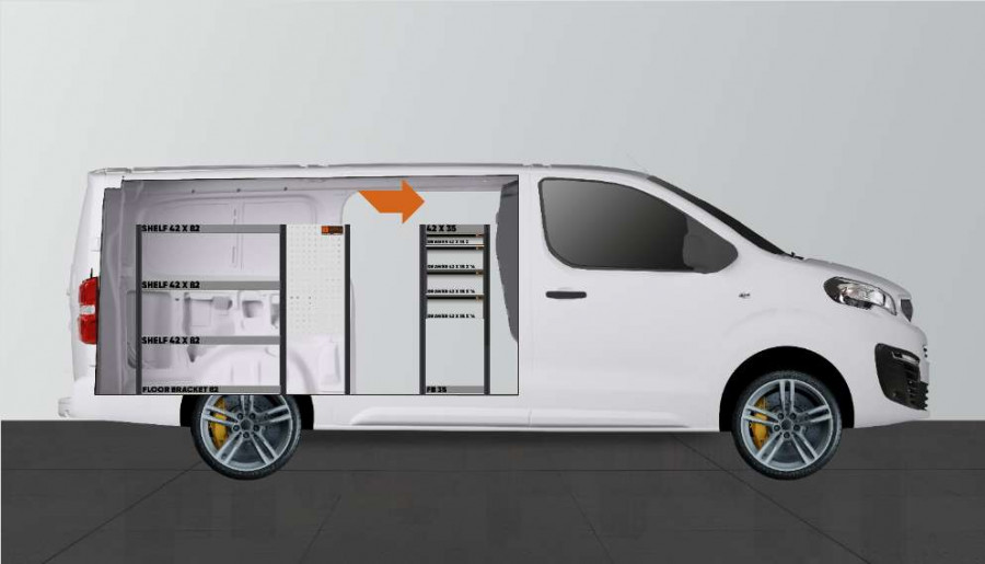 En af de mest populære indretninger til din Peugeot Expert, Citroen Jumpy, Opel Vivaro , Fiat Scudo & Toyota ProAce. Indretningen giver varierende opbevaringsmuligheder, da der er nem adgang til skufferne på kuglelejerne fra sidedøren, samtidig med at skufferne kan trækkes ud i kørselsretningen for at give et godt overblik. Disse kan suppleres med skuffeinddelere for optimal organisering. Vores dybe hylder giver også gode opbevaringsmuligheder til både værktøjskufferter og mindre maskiner.