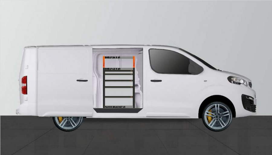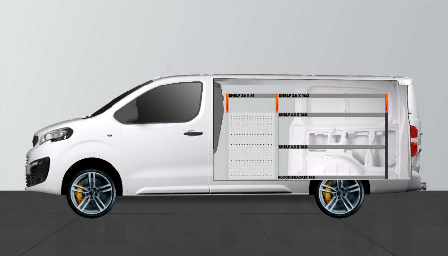 Dette er et af de mest populære systemer til Peugeot Expert, Citroen Jumpy, Opel Vivaro , Fiat Scudo & Toyota ProAce, med sidedør i samme side som indretningen. Indretningen giver gode opbevaringsmuligheder for såvel værktøjskufferter og maskiner som de mindre dele. Du får en skuffeenhed med 5 stk. skuffer i varierende størrelser. Bag skufferne er der placeret en værktøjstavle for ekstra ophængningsmuligheder i bilen. Skufferne på kuglelejeskinner suppleres ofte med vores nye skuffeindsatser og rumdelere. Gavlen kan med fordel suppleres med vores smartboxes for at maksimere opbevaringspladsen.