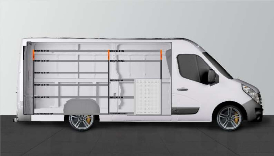Dette er et af de mest populære systemer til Opel Movano, Renault Master & Nissan NV400 L3, med sidedør i samme side som indretningen. Indretningen giver gode opbevaringsmuligheder for såvel værktøjskufferter og maskiner som de mindre dele. Du får en skuffeenhed med 5 stk. skuffer i varierende størrelser. Bag skufferne er der placeret en værktøjstavle for ekstra ophængningsmuligheder i bilen. Skufferne på kuglelejeskinner suppleres ofte med vores nye skuffeindsatser og rumdelere. Gavlen kan med fordel suppleres med vores smartboxes for at maksimere opbevaringspladsen.