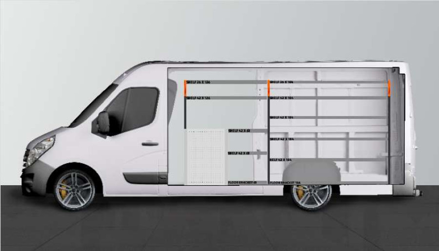 Dette er et af de mest populære systemer til Opel Movano, Renault Master & Nissan NV400 L3, med sidedør i samme side som indretningen. Indretningen giver gode opbevaringsmuligheder for såvel værktøjskufferter og maskiner som de mindre dele. Du får en skuffeenhed med 5 stk. skuffer i varierende størrelser. Bag skufferne er der placeret en værktøjstavle for ekstra ophængningsmuligheder i bilen. Skufferne på kuglelejeskinner suppleres ofte med vores nye skuffeindsatser og rumdelere. Gavlen kan med fordel suppleres med vores smartboxes for at maksimere opbevaringspladsen.
