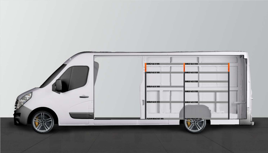 En bilindretning til din Movano, Master & NV400 L4H2, der giver gode opbevarings muligheder for både værktøjskasser, maskiner og mindre sortiment. De indvendige designhylder med en dybde på 420 mm betyder, at de fleste af markedets værktøjskasser passer perfekt. Den øverste hylde på 262.5mm er normalt almindelig at supplere med vores nye modulbakker for at give det mindre sortiment sin rette plads. Glem ikke at bruge værktøjstavlen på gavlen.