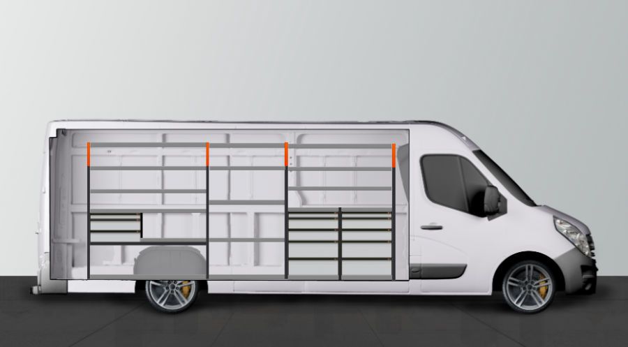 Leder du efter en masse skuffer? Har du også store krav? Så er dette muligheden for dig og din Movano, Master & NV400 L4H2. I alt får du her 13 kasser på kuglelejer. Bilindretning giver gode opbevaringsmuligheder for både dine værktøjstasker, maskiner og dit mindre sortiment. Du får en kommode med kasser i forskellige størrelser for at give hvert sted, sin plads. Kasserne på kuglelejer er populære at supplere med vores nye sortimentskasser for at skabe den bedste struktur. Fordelt belastningsvægt i kasser på kuglelejer er 35 kg / pc. Kassernes indvendige dimensioner er (mm) B-579, D-387, H-60, H-130 og H-200. Tilbehøret på billedet er ikke inkluderet, men kan naturligvis købes.