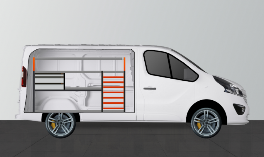 Bilindretning med skuffer, hyldeopbevaring og sortimentsholder, der passer til Talento, NV300, Vivaro & Trafic L1H1