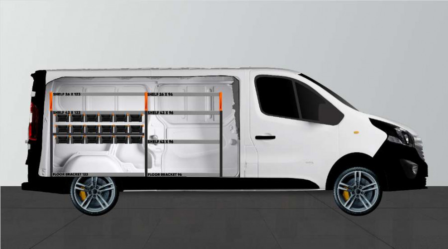 V-Rack RACK er en ny, brancheførende bilindretning til Fiat Talento, Nissan NV300 & Renault Trafic L2. Den passer perfekt til dig, der har brug for gode opbevaringsmuligheder til dit sortiment som f.eks. skruer, koblinger, bolte, bor med mere. Indretningen er maksimeret med i alt 18 af vores nye, inddelelige modulbakker. Modulbakkerne trækkes ud på fastmonterede skinner, hvilket giver let adgang. Fronten på modulbakkerne er udformet for optimal tilgængelighed og kan suppleres med transparent front og tværgående inddelere, som kan sættes efter hver 60 mm.